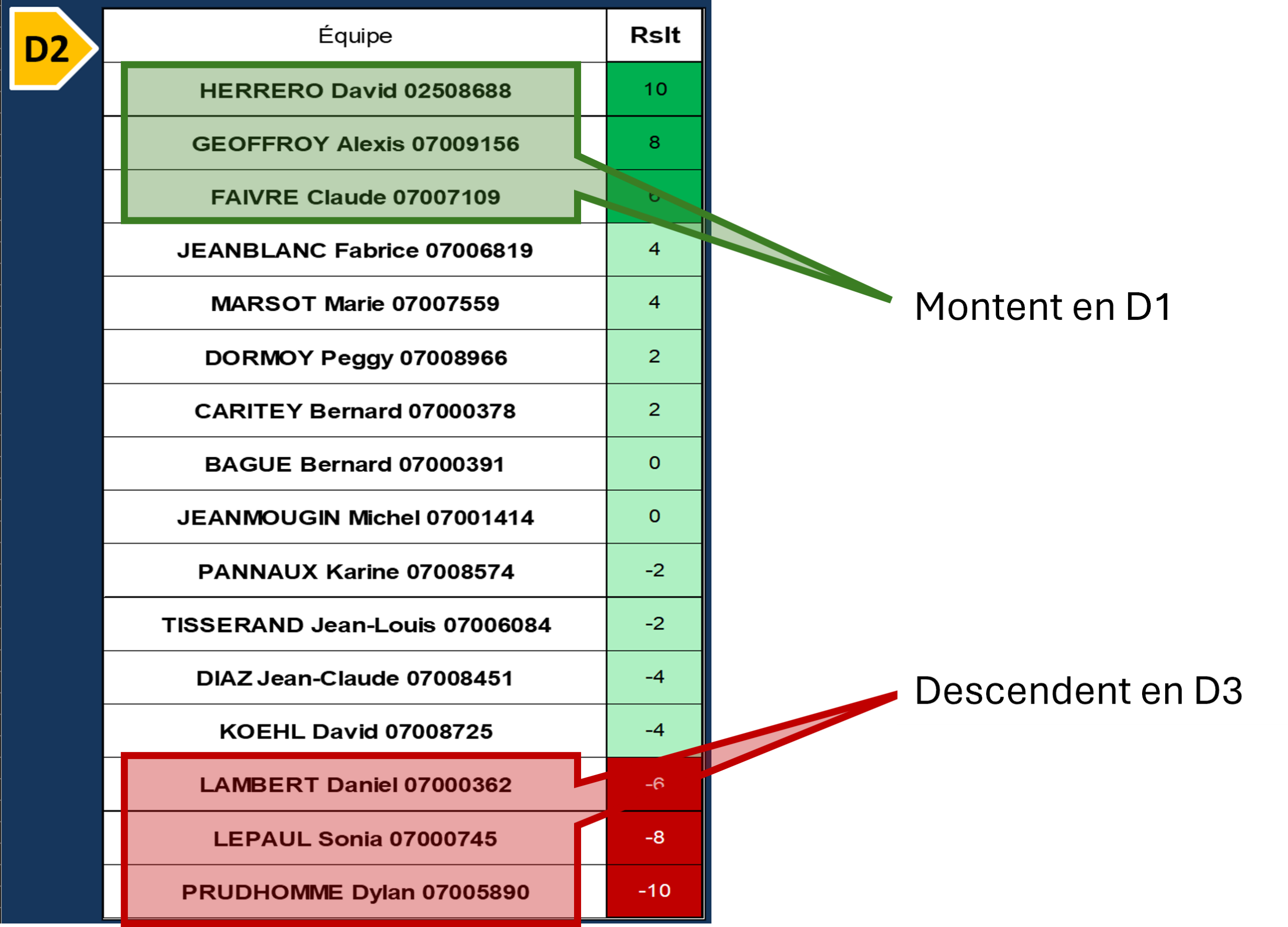 | Clas. | Chef d'équipe | Club | nb pt. | Crit6 | Crit5 | Crit4 | Crit3 | Crit2 | Crit1 | Pénalité | Nb équipes |